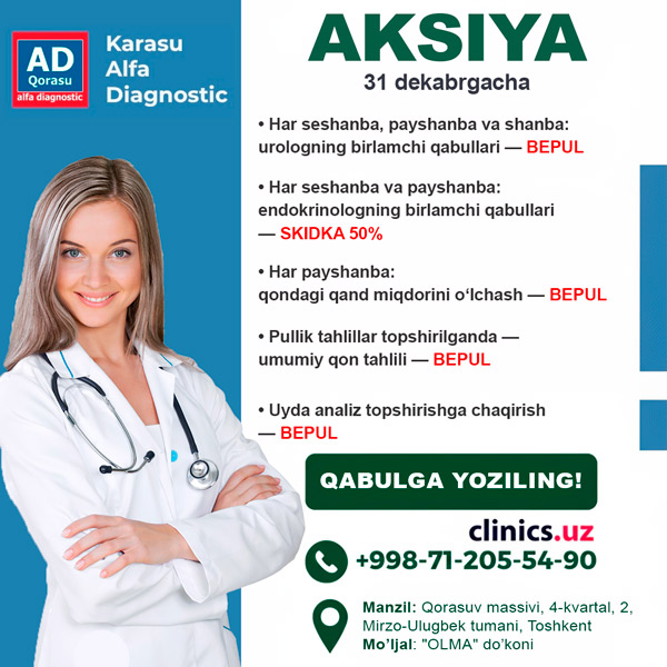 Siz uchun saralab, klinikaga albatta borishga arzirlі aksiya topdik. Vaqt o‘tkazmay — siz bilan bo‘lishyapmiz!